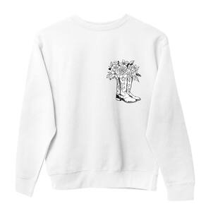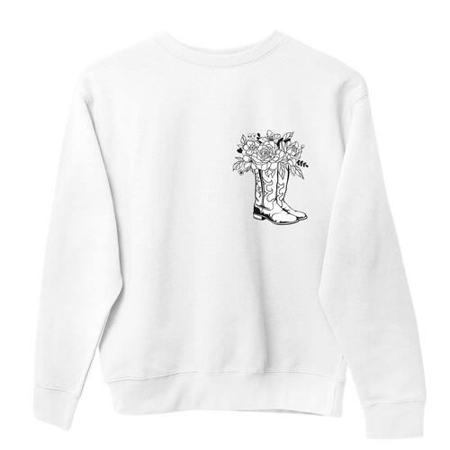 Moletom Careca Algodao Feminino Estampa Bota Country Flores Minimalista Quentinho Confortavel - Branco - M