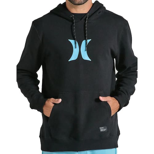 Moletom Hurley fechado 250g, estampa ICON frontal, capuz com cordão e bolso canguru com etiqueta.