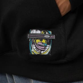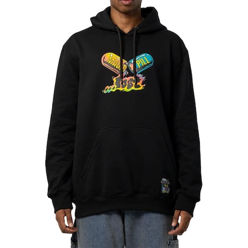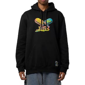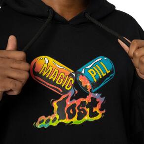 Moletom Lost com bolso frontal amplo, estampa localizada no peito, punhos e barra com elástico para maior proteção e estampas em tinta neon que reagem à luz negra.