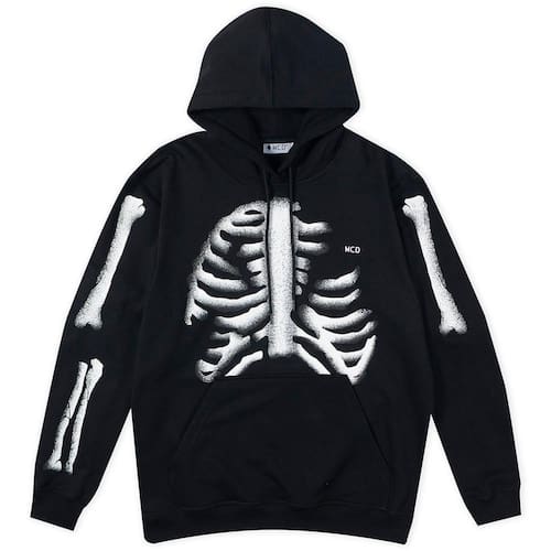 Moletom MCD felpado 310g, modelagem regular, bolso canguru, estampa de ossos nos braços, estampa frontal, capuz com ajuste e etiquetas personalizadas.