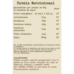 Molho Orgânico de tomate grape com manjericão, naturalmente doce, com pouca acidez e sabor inigualável. Tomate grape, tomate italiano, manjericão, sal rosa do Himalaia , orégano, cebola, alho e pimenta preta. Ingredientes orgânicos VALIDADE: 18 meses. Após aberto conservar refrigerado e consumir em até 3 dias. Quantidade por porção de 60g 3 colheres de sopa %VD Valor energético17 kcal = 72 Kj 1% Carboidratos3,6 g 1% Proteínas0,4 g 1% Fibra alimentar1,1 g 4% Sódio80 mg 3% Não contém quantidades significativas de gorduras totais, gorduras saturadas e gorduras trans. % Valores Diários de Referência com base em uma dieta de 2.000 kcal ou 8400 kj. Seus valores diários podem ser maiores ou menores dependendo de suas necessidades energéticas.