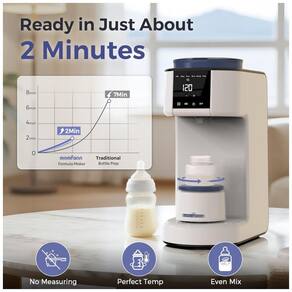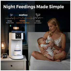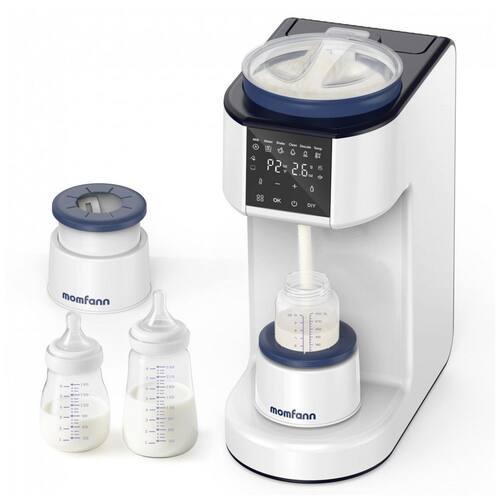 Preparador automático de mamadeiras MOMFANN dosa pó de fórmula de 0,1 g a 99 g com água de 30 ml a 300 ml, ajustável via função DIY que salva configurações para marcas específicas de fórmula infantil. Equipado com 3 temperaturas (37°C, 40°C, 45°C) e base agitadora inteligente para mistura uniforme, opera a 50 dB para uso noturno. Indicado para alimentação precisa em rotinas diárias, com alertas de limpeza após 100 L de água e descalcificação após 400 L. Construído em materiais livres de BPA. Tecnologias incluem limpeza one-touch para funil e sistema de água, além de agitador com timer que simula movimento manual para reduzir bolhas. Funcionalidades: dosagem precisa para todos os tamanhos de mamadeiras, flush automático e lembretes inteligentes de manutenção. Compatível com a maioria das mamadeiras e todas as marcas de fórmula infantil. Cuidados: configure proporção pó-água na primeira utilização; execute limpeza após alertas; armazene em local seco.