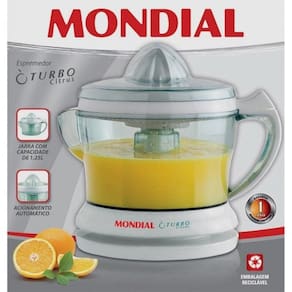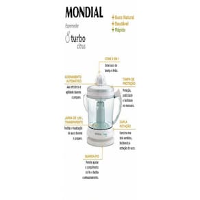 Para promover habitos mais saudaveis, experimente o Espremedor de Frutas Mondial Turbo Citrus! Muito pratico, o modelo Turbo Citrus da Mondial oferece a rapidez que voce precisa no dia a dia para fazer sucos maravilhosos para sua familia. Com motor sincrono superpotente, e possivel preparar varios sucos de maneira simples e pratica.