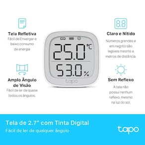 Instalação Flexível Indicadores de conforto Sensor de alta precisão Notificações Instantânea Tela E-Ink de 2.7 polegadas Controle o que exibir no display Umidade Operaciona 0%99% UR Monitoramento Preciso em Tempo Real Maximize seu conforto e economize energia Amplitude de Temperatura Exibida 050ºC / 32122ºF Tapo Hub é necessário para recursos inteligentes como monitoramento remoto, automação, exportação de dados e etc