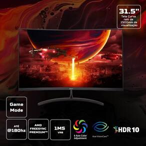 Monitor Acer 32 Edt320q S3biipx Nitro Led/Ips Full Hd 180hz 1ms Hdmi Display Port Freesync Vesa Curvo - Um.Je0aa.305 Mergulhe em um Mundo de Ação Sem Limites Sinta a adrenalina de cada partida com o monitor gamer Acer Nitro EDT320Q. Seu painel curvo de 31.5 polegadas te envolve em um universo de cores vibrantes e detalhes nítidos, enquanto a taxa de atualização de 180Hz e o tempo de resposta de 1ms garantem imagens fluidas e sem lag, perfeito para os jogadores mais exigentes. Com o Nitro EDT320Q, você estará sempre um passo à frente da concorrência. Uma Experiência Visual Épica Obtenha uma vantagem no jogo com oito modos de exibição predefinidos para otimizar os visuais para diferentes tipos de conteúdo: Ação, Corrida, Esporte, Usuário, Padrão, ECO, Gráfico e Filme. Essa tecnologia exclusiva pode ser facilmente acessado por meio do menu de configurações do On Screen Display OSD . O Monitor Gamer Completo para Todos os Jogadores Os monitores Acer usam uma forma única de ajuste de cor de 6 eixos para ajudar os profissionais a obter a cor e o tom exatos que preferem. Usando este recurso, o usuário pode ajustar matriz e saturação em 6 eixos. Esses eixos variam de R,G,B a C,M e Y, e permitem ao usuário adequar as cores do monitor às suas necessidades profissionais. Características: - Marca: Acer - Modelo: EDT320Q Especificações: - Cor: Preto - Tamanho da Tela: 31.5 curva com raio de 1500 mm de visualização - Proporção da Tela: 16:9 - Tipo de moldura da tela: 3S E2E - Tipo de painel: LED VA - Tela anti reflexo: Sim - Design da Tela Zero Frame sem moldura nas laterais e parte de cima - Máxima resolução e taxa de atualização HDMI: Full HD 1920 x 1080 180 Hz - DisplayPort: Full HD 1920 x 1080 180 Hz - Área de exibição ativa mm 698 x 393 - Pixel Pitch mm 0.364 - Frequência horizontal e vertical Frequência horizontal HDMI: 31.469 a aproximadamente 199.800 KHz - DisplayPort: 31.469 a aproximadamente 199.800 KHz - Frequência vertical HDMI: 48 a aproximadamente 180 Hz - DisplayPort: 48 a aproximadamente 180 Hz - Tempo de resposta: 1 ms VRB Visual Response Boost - Brilho cd/m2 250 nits - Ângulo de visão: 178o esquerda / direita e 178o cima / baixo - Contraste Nativo: 3000:1 - Contraste Maximo: 100.000.000:1 Adaptive Contrast Management - Quantidade total de cores exibidas: 16.7 Milhões - Profundidade de cores: 8 bit - Color gamut saturação de cor : NTSC 72% - Portas: 2x HDMI 2.0 , 1x DisplayPort 1.4 , 1x saída de áudio e entrada de alimentação - Vesa Montagem na parede : 100 x 100mm - Ajuste de pivo posição vertical em pé : Não possui - Ajuste de altura: Não possui - Rotação: Não possui - Ângulo de Inclinação: -5 a aproximadamente 20 - Alto-falantes: Não possui - Fonte de alimentação: Externa com pinos padrão brasileiro Bi-Volt 100-240 V - Consumo de energia com produto energizado: Desligado: 0.3 W / Descanso: 0.5 W / Ligado máximo : 42 W - Dimensão do monitor com a base: cm 70.90 L x 51.48 A x 19.60 P Conteúdo Da Embalagem: - Fonte de alimentação - Monitor - Suportes - Manual em português - Cabo de energia - Cabo HDMI : 1 ano de 3 meses de legal + 9 meses de contratual junto ao fabricante Peso: 8730 gramas bruto com embalagem Marca: Não Informado
