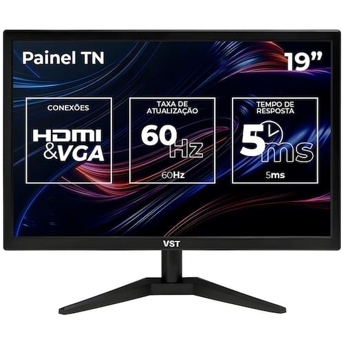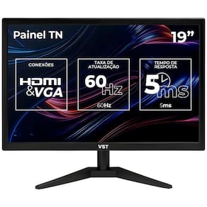 Por que Escolher o Monitor LED 19" VST?Combinando funcionalidade e acessibilidade, o Monitor LED 19" VST é perfeito para quem precisa de um monitor confiável e de alto desempenho para as tarefas do dia a dia. Seu tempo de resposta rápido e resolução HD garantem imagens de qualidade, enquanto a conectividade diversificada proporciona praticidade.