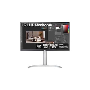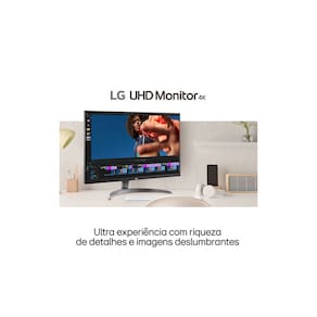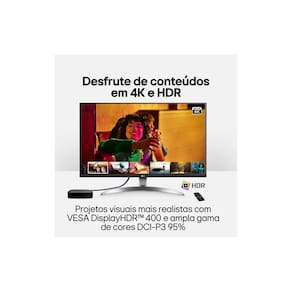 Monitor LG UHD 4K , Tela IPS de 27", VESA Display HDR 400, Gama de cores: DCI-P3 95% (CIE1976), Espectro: até 1 bilhão de cores , Ajustes de posição: inclinação, altura e rotação.