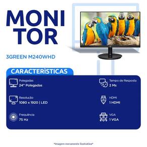 Nao perca nenhum detalhe dos seus games, series ou relatorios com o tela de alta resolucao do 3Green! Com dimensao de 24 Polegadas, o monitor possui painel LED e resolucao Full HD para exibir todo seu conteuda da melhor forma possivel. Alem disso, o tempo de resposta de 2ms e taxa de atualizacao de 75hz proporciona cenas fluidas.