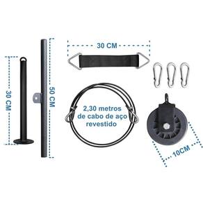 Mono Cross Over De Polia Móvel - Pulley Puxada Alta (S) O Mono Cross Polia Móvel deve ser utilizado com anilhas para carga/peso no equipamento. O Mono Cross possibilita execução de exercícios de puxada alta, permitindo o desenvolvimento e ganho de massa muscular em seus tríceps e costas. Conteúdo:1 suporte com polia móvel com roldana PP de 100 mm;1 Barra reta de 50 cm;3 mosquetões medida 7X70 mm;1 Suporte para Anilhas de 30 cm;1 Alça para engate da polia;2,30 metros de cabo de aço 1/8 revestido;Capacidade de carga do Mono Cross: 100kg. IMPORTANTE: o conjunto não acompanha as anilhas. Também não acompanha a barra de fixação na parede, o equipamento precisa ser alçado em alguma estrutura como uma barra fixa ou Rack.