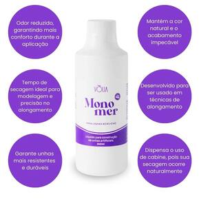 O Monomer Líquido da Vlia é um produto desenvolvido para a construção de unhas artificiais, especialmente em técnicas de alongamento acrílico. Uma de suas principais características é o odor reduzido, proporcionando uma experiência mais agradável durante a aplicação. Além disso, o monomer auxilia na resistência do alongamento e ajuda a prevenir o amarelamento das unhas, garantindo um acabamento duradouro e esteticamente agradável. O monomer líquido dispensa o uso de cabine, com sua secagem ocorrendo naturalmente ao ar, pois o monomer reage com o pó acrílico, formando uma massa que endurece sozinha após a modelagem. A embalagem econômica de 240ml oferece um excelente custo-benefício para profissionais da área. O produto possui secagem intermediária, permitindo tempo adequado para modelagem e aplicação precisa.