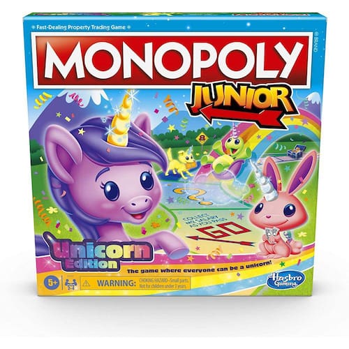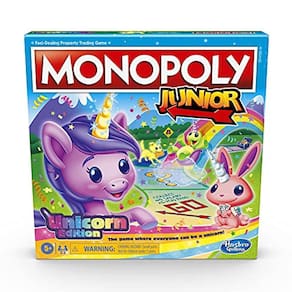 Colete o máximo de dinheiro enquanto percorre uma viagem imaginária pelo colorido mundo dos unicórnios! Os jogadores movem seu adorável símbolo de unicórnio ao redor do tabuleiro comprando e vendendo propriedades como granulado, glitter, chapéus de festa e outras coisas que os unicórnios adoram. É muito divertido para as crianças colocar um letreiro "vendido" em sua própria propriedade. E se um jogador possui ambas as propriedades da mesma cor, eles podem cobrar o dobro do aluguel! O jogo Monopoly Junior: Unicorn Edition é um jogo de tabuleiro de jogo rápido projetado para crianças de 5 anos ou mais, como uma introdução à jogabilidade clássica do Monopólio. Pode ser uma ótima escolha para a diversão da escola em casa, e uma coisa divertida de se fazer enquanto fica em casa. Os nomes e logotipos Hasbro, Hasbro Gaming, Parker Brothers e Monopoly, o design característico do tabuleiro de jogos, os quatro quadrados de canto, o nome e o caráter mr. Monopoly, bem como cada um dos elementos distintos do tabuleiro e peças de jogo são marcas comerciais da Hasbro para seu jogo de negociação de propriedades e equipamentos de jogo.