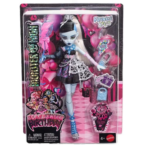 Prepare-se para uma festa assustadoramente doce com a boneca Monster High Aniversário Frankie Stein! Celebre o aniversário de 1.600 anos da Draculaura com um estilo impecável e acessórios exclusivos. Frankie Stein em um traje de festa deslumbrante e acessórios temáticos. Com acessórios como bolsa e chave, tanto as crianças quanto os colecionadores ficarão felizes em ajudar a boneca Cleo a se preparar para o baile da meia-noite! Na hora da festa, quanto mais, melhor!