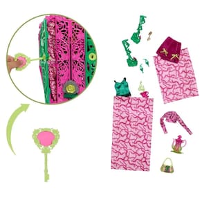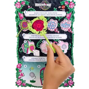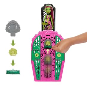 Descubra pistas para destrancar as portas de Monster High e desvende os mistérios abrindo os pacotes cheios de acessórios surpresa. Entre na experiência de desembalar a boneca fabulosa e todas as peças incluídas. Esta onda de Skulltimate Secrets é assustadoramente legal!