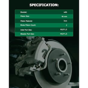 - Especificação da pinça de freio: Contagem de pistões de freio: 2 pistões; Tamanho do pistão: 4,6 cm; Tamanho da porta de entrada: M10 x 1,5; Tamanho da porta de sangria: M10 * 1,5; Suporte da pinça de freio: com; As pinças de freio são revestidas para aumentar a longevidade das peças