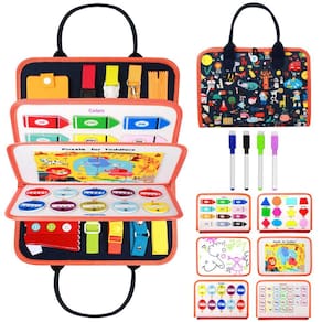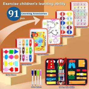- Esta prancha para crianças pequenas inclui 8 fivelas, uma fivela de bolsa, uma fivela de bolsa, uma fivela de calça e saia, um cadarço, um zíper. Abra o zíper. O zíper interno pode conter pequenos objetos do bebê. Também inclui seis temas, polígonos, cartões coloridos, cartões numéricos, cartões com letras, quebra-cabeças e uma prancheta com quatro canetas coloridas.