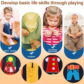 - O Montessori Busy Board permite que as crianças aprendam habilidades básicas, como amarrar os sapatos, fechar o zíper, apertar os botões de várias maneiras diferentes, etc. As crianças aprendem brincando sem se sentirem entediadas.