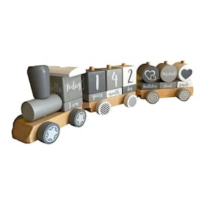 - Comece sua jornada júnior com trens de madeira - Seja sentado, engatinhando, experimentando a comida ou dizendo a primeira palavra, há muito o que comemorar durante o primeiro ano e o marco mensal do bebê garantirá que o momento seja lembrado para sempre. O trem Milestone apresenta o primeiro sorriso, o primeiro rastejamento, o Halloween, o Natal, etc. Na verdade, um bloco marcante único que captura momentos especiais.
