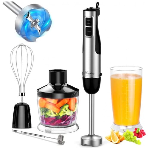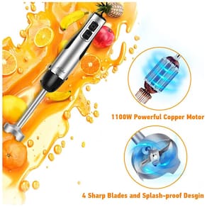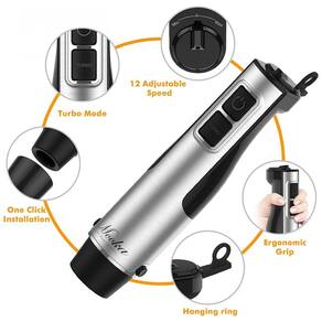 Multifuncional 5 em 1 O conjunto de varinha de imersão inclui o corpo principal da varinha, copo de mistura de 600 ml, processador de alimentos de 500 ml, batedor e batedor de leite. BPA Free. Você pode ter certeza de fazer sucos, smoothies, sopas e legumes picados, carnes, creme de leite, perfeito para fazer comida de bebê saudável. Poderoso e rápido Este mixer elétrico possui predefinições de mistura de 12 velocidades , turbo, função de pulso para rajadas curtas de energia. O motor todo em cobre de 1100 W tem um nível de ruído notavelmente baixo. Projetado para ser com uma mão, o design é ergonômico e compacto. Lâmina aprimorada e cozimento rápido O misturador de emulsão portátil com lâmina de 4 folhas banhada a titânio ajuda você a misturar facilmente os alimentos mais duros. A base de mistura em forma de sino minimiza a sucção e os respingos. Misture e faça um purê para uma textura super suave em um flash, bata e pique em segundos. Fácil de usar e limpar O liquidificador portátil é fácil de trocar de acessórios, uso combinado de picador, liquidificador, batedor de leite, batedor de ovos. A conexão perfeita de 360 é a maneira mais segura de usar os acessórios do liquidificador. Os acessórios Enxaguar facilmente com água da torneira para manter a sua cozinha impecável