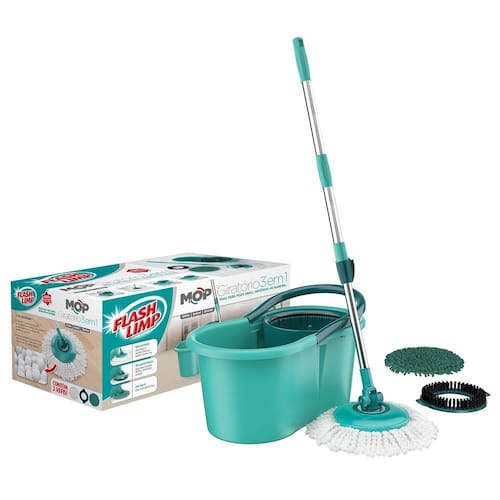 O Mop Giratório 3 em 1 da FlashLimp é ideal para pisos frios, sintéticos ou madeira. Alças flexíveis para facilitar o transporte e o manuseio.