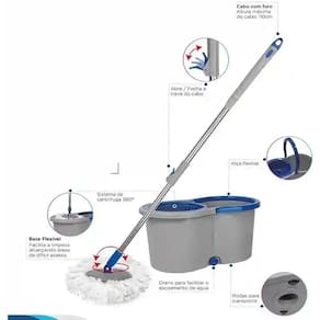 Versátil e prático: ideal para pisos de porcelanato, sintéticos ou laminados. Sistema giratório de centrifugação: elimina a necessidade de torcer o pano, evitando o contato das mãos com a sujeira. Cabo em aço inox ajustável (104 cm a 125 cm): possui trava para regulagem fácil e base flexível que alcança cantos e locais de difícil acesso. Refil de microfibra lavável: oferece maior absorção e pode ser lavado em máquina. Cesto em aço inox: proporciona mais resistência, durabilidade e desempenho até em limpezas pesadas. Balde com capacidade total de 13 litros (7 litros úteis): ideal para ambientes maiores. Rodinhas e alça flexível: facilitam o transporte e garantem estabilidade durante o uso.