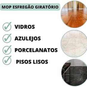 Benefícios • Sistema de centrifugação que reduz o excesso de água • Microfibra com alta capacidade de absorção • Base giratória que alcança áreas difíceis • Cabo leve que proporciona mais conforto no uso • Estrutura resistente para uso frequente