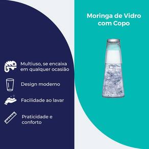 A Moringa de Vidro com Copo é um recipiente utilizado para servir líquidos, geralmente água. Seu formato tem a base mais larga que o gargalo, que a diferencia de uma jarra comum. É uma peça prática que conserva bem a temperatura da água.