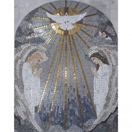 Neste belo e significativo mosaico, dois observam atentamente o momento em que o Espírito Santo derrama suas bênçãos sobre a humanidade.