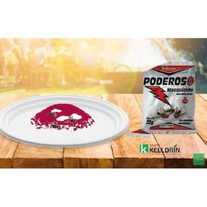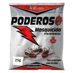 MODO DE USAR: Coloque 25g do PODEROSO MOSQUICIDA para 12,5 m² em recipientes de plástico ou papelão (ex: pratinhos descartáveis), dê uma pequena umedecida no produto e coloque-o nos locais de maior frequência das moscas. Renove a aplicação quando notar perda de eficiência.
