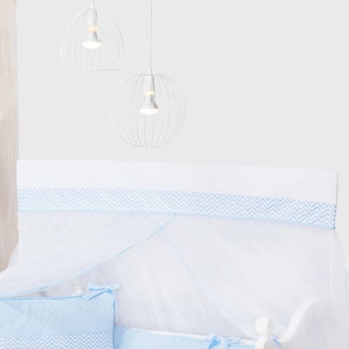 Mosquiteiro Para Berço Americano Com Bandô Chevron AzulConheça nosso Mosquiteiro para Berço Americano ou Nacional, Perfeito para o Berço Itens Inclusos:- 01 Mosquiteiro com Bandô 6,00 m circunferência x 1,40 m largura x 1,70 m altura .Composição:- Bandô: 100% Algodão.- Mosquiteiro: 100% Poliamida.