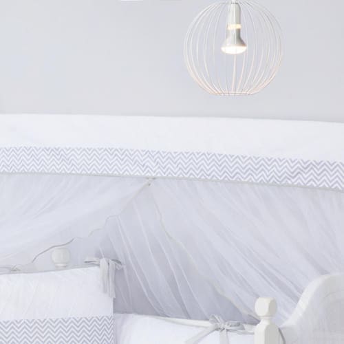 Mosquiteiro Para Berço Americano Com Bandô Chevron CinzaConheça nosso Mosquiteiro para Berço Americano ou Nacional, Perfeito para o Berço Itens Inclusos:- 01 Mosquiteiro com Bandô 6,00 m circunferência x 1,40 m largura x 1,70 m altura .Composição:- Bandô: 100% Algodão.- Mosquiteiro: 100% Poliamida.