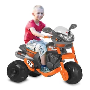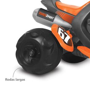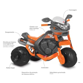 As crianças querem mais aventuras! A Moto Elétrica Bandeirante Supersport 6V - Laranja promete radicalizar as brincadeiras. Ela tem design detalhado igual ao de uma moto de verdade, com escapamento e carenagem. O funcionamento é elétrico, basta o baixinho pisar no acelerador para começar seu passeio. Possui rodas largas que garantem mais estabilidade e câmbio com duas marchas: frente e ré. Assim a garotada pode passear e brincar à vontade!