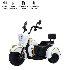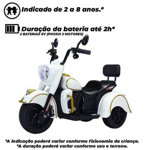 Moto elétrica grande infantil menino menina 2 baterias 6v Cor: branca Mini moto elétrica infantil good mood - chopper Seu pequeno a vai se amarrar com a mini moto elétrica, feito especialmente para proporcionar mais diversão e ajudar no desenvolvimento pedagógico. Ela ajuda na coordenação motora, percepção de movimento, entre outras coisas. Hora de se aventurar Movida a bateria recarregável, com luz e sons, além de ser super fácil de carregar, de forma que será uma boa opção para divertir-se nos parques, praças ou no sítio. Recarregável acompanha carregador bivolt - carregador com ponta tipo americana, deverá usar adaptador benjamin-t - o produto não acompanha adaptador. Bateria: 2 baterias de 6v unipower - de 1 ano diretamente com a fabricante . Velocidade máxima: 5km/h. Duração bateria: 1h a 2hs varia conforme uso e vida útil da bateria . Estrutura em aço e bases plásticas. Funções: frente e ré botão central Acelerador: pé direito . Led no farol e lanternas. Toca música, entrada usb, faz barulho de buzina. Rodas Possui 3 rodas para maior estabilidade fabricadas em plástico. Dimensões Montada: 112cm x 53cm x 62cm cxlxa Adesivos vinílicos. Indicado para qual idade Indicado de 2 anos até 8 anos. Suporta até 60kg. Realize a montagem ao receber com regulagens O produto segue semi-montado, ao receber realize sua montagem seguindo as indicações verifique se está regulado para melhor utilização pela criança. Sempre indicamos levar à uma oficina especializada para montagem. Homologação Inmetro: ABCP-BRI-0081-2021-22
