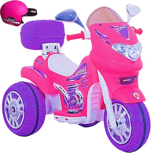 Quer mais? A Moto Elétrica Sprint Turbo Power 12V da Biemme possui ainda buzina, farois dianteiros que acendem de verdade, sons, assento anatômico, baú, motor lateral decorativo e um lindo capacete de brinquedo!