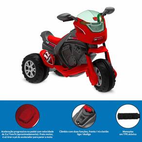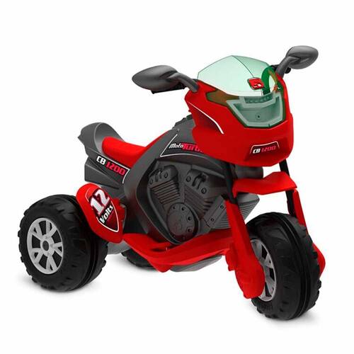 Moto Elétrica Infantil - CB1200 - 12v - Bandeirante: procurando uma motoca infantil para criança? A Moto Elétrica CB1200 é o modelo ideal para a diversão das crianças. Com design e motor 12v pra turbinar a diversão das crianças por horas! Detalhes: • Câmbio com duas marchas: frente e ré • Movida por bateria recarregável 12v • Freio motor • Rodas grandes • Acompanha carregador automático 127/220V • Dispositivo de proteção do sistema elétrico • Manoplas em TPE atóxico Informações: • Produto: Moto CB1200 Elétrica 12v • Marca: Bandeirante Brinquedos • Tipo: Motoca Elétrica Infantil • Categoria: Veículo Elétrico Infantil • Dimensões (C x A x L): 96.5 x 69 x 56 cm • Peso máximo suportado: até 30 kg • Altura máxima sugerida: 1.26m • Velocidade aproximada: 3-7 km/h • Conteúdo: 1 moto e manual • Recomendação: para crianças a partir de 03 anos de idade Especificações: • Referência: 2663 • Código de Barras: 7899091426638 • Embalagem (C x A x L): 82.5 x 59 x 54 cm • Embalagem (Peso): 8.2 kg • Material / Composição: Plástico injetado e resistente • Registro: 002863/2021 OCP 0061 • Certificado: Órgãos Autorizados - OCP´S (Organismos de Certificação de Produtos) Aviso: • As imagens são meramente ilustrativas • Os pesos, tamanhos e medidas são aproximados • As cores e estampas dos produtos podem ter variações • As informações são de responsabilidade do fabricante ou fornecedor