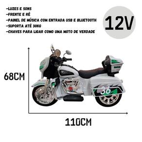 Características principais: -bagageiro: espaço extra para transportar brinquedos e acessórios durante a brincadeira. -painel de música: com música embutida para deixar a pilotagem ainda mais divertida. -bluetooth e usb: conecte dispositivos móveis para tocar as músicas favoritas dos pequenos pilotos. -frente e ré: facilita a manobra em qualquer direção, garantindo uma experiência completa. -chave para ignição: simula a experiência real de ligar uma moto, tornando a brincadeira ainda mais autêntica.