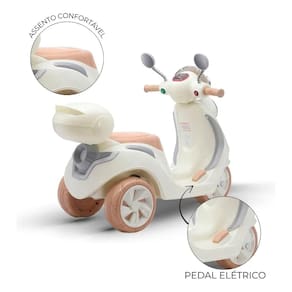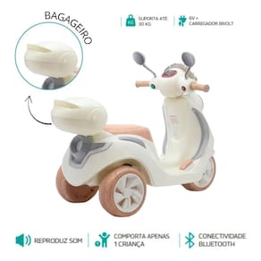 -Alcança uma velocidade máxima de 5km/h. -Com luzes e sons. -Idade mínima recomendada: Idade: +24 meses -Inclui carregador. -Tem 37cm de largura, 47cm de altura e 69cm de comprimento, Peso 6,1kg -Momentos de diversão garantidos. -A duração da bateria depende do uso que se dê ao produto. -Moto Eletrica Scooter 6V -Botão frente e ré -Farol que acende de verdade -Módulo de som com entrada para USB e AUX (cabo MP3 não incluso) -Conectividade Bluetooth -Indicador de Bateria -Dispositivo de proteção do sistema elétrico -Movido por bateria recarregável -Farois que acendem de verdade -Categoria: Elétrico -Peso máximo suportado: 30kg -Velocidade máxima: 3,5 km/h -Bateria: 6V 4Ah selada -Duração da bateria: 1 hora “NO MÁXIMO” -Tempo de recarga: Primeira recarga 6 horas; demais 4 a 6 horas -Acelerador: Acionamento via pedal -Simula Partida -Carregador de bateria bivolt (110/220V) -Montagem: Este brinquedo vem desmontado. Basta seguir as instruções do manual. Montagem simples e fácil.