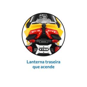 Farol dianteiro com iluminação realLanterna traseira com iluminação realLimitador de giro do guidãoEntrada USB e conexão BluetoothSeletor de músicaBotão de liga e desligaBotão de frente, ré e ponto mortoAceleração progressiva na manoplaFreio a pedalDispositivo de proteção do sistema elétricoMovido por bateria recarregável de 12VIndicador de bateriaAcompanha carregador 110/220V