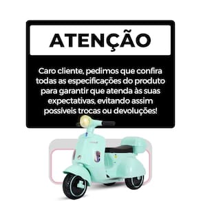 Especificações Técnicas: - Modelo: Scooter, um design clássico que nunca sai de moda. - Código Fabricante: 3212, garantia de autenticidade e qualidade. - Material das Rodas: Plástico Reforçado, para maior segurança e durabilidade. - Velocidade Máxima: 3 Km/h, ideal para manter a segurança das crianças. - Bateria: 6v (Bivolt), oferecendo entre 1h a 2h de autonomia. - Potência do Motor: 380W, potência adequada para uma experiência de pilotagem suave e segura.