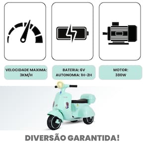 A Moto Elétrica Infantil Scooter Avespa Verde Tiffany 3043 da Uni Toys é mais que um brinquedo; é uma ferramenta de desenvolvimento, aventura e diversão. Projetada para ser segura, durável e divertida, esta scooter elétrica é o veículo ideal para pequenos exploradores. Adquira já e proporcione momentos inesquecíveis de alegria e desenvolvimento para seu filho!