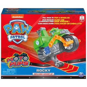 Acelere com o veículo Moto Pups Deluxe de Rocky da PAW Patrol para resgates emocionantes A motocicleta exclusiva de Rocky apresenta gráficos e detalhes autênticos, rodas grandes e uma função pullback que permite realizar cavalinhos. A figura de Rocky incluída está pronta para a ação dos Moto Pups, vestindo sua jaqueta de motociclista e capacete. Prenda Rocky no banco do motorista, puxe o veículo para trás e observe o partir em alta velocidade. Os veículos Moto Pups Deluxe dão vida às motocicletas da PAW Patrols do seriado de sucesso. Colecione todos eles para salvar o dia Compatível com o Playset Moto HQ vendido separadamente. O veículo PAW Patrol Moto Pups Rocky Deluxe é o presente perfeito para crianças a partir de 3 anos. Não são necessárias baterias.