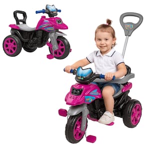 Indicação: A partir de 12 meses Capacidade máxima: 30kg Função passeio com empurrador, aro protetor e apoio para os pés Função pedal com pedais de tração com corrente de aço Cinto de segurança presente nas duas fases Haste com gancho que suporta até 1,5kg Pedal com eixo e corrente de aço Com buzina Assento anatômico Composição: Polietileno, plástico, metal e borracha Garantia: 90 dias (fornecida pelo fabricante) Certificado de Segurança Inmetro: Registro nº 007291/2021
