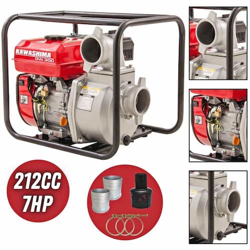 Motobomba Kawashima GW300 é equipada com motor à gasolina 4 tempos de 212cc, possui diâmetros de sucção/saída de 3" ;(76mm), com altura de de 26m e vazão maxima de 60m/h, com partida manual. ;A Motobomba é portátil, econômica e fácil de operar. Indicada para o uso agrícola e urbano, ideal para a transferência de água limpa. Pode ser usada no abastecimento de caixas de água, cisternas e irrigação.