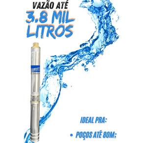 - Potência 3/4 HP - Estágios 14 - Diâmetro 3 ” (75,0 mm) tubo acima 100 mm. - Voltagem 127V ou 220V - Altura máxima 84,1 M - Vazão máxima 3.800 L/H - Recalque 1” - Frequência 60 Hz