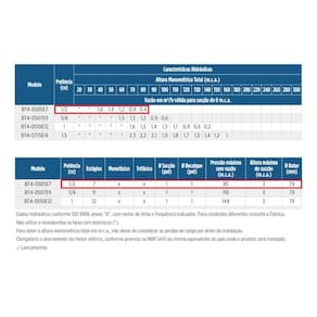 Especificações Técnicas: Modelo: BT4-0505E7 - Lateral de entrada e bocal de saída de ferro fundido Fase: Monofásica com Capacitor Voltagem: 127/220V Potência: 1/2 cv Estágios: 7 Diâmetro Sucção: 1 Polegada Diâmetro Recalque: 1 Polegada Pressão máxima sem vazão: 85 m.c.a Altura máxima de sucção: 3 m.c.a Rotor: 79 mm Rotor fechado de Celcon - Tipo de Polímero Difusores de Noryl GFN3 - 30% de Fibra de Vidro. Bocais de sucção e recalque de ferro fundido GG-20 ou inox AISI-304, com rosca BSP 1. Selo mecânico constituído de aço inox AISI-304, buna N, grafite e cerâmica. Sistema de estágios flutuantes TRI-SEAL. Importante: Temperatura máxima do líquido bombeado: 40C