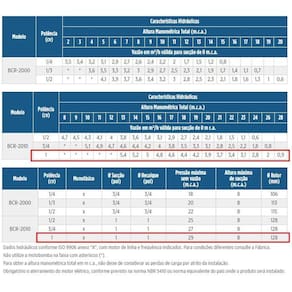 Especificações Técnicas: Bocais com rosca BSP Caracol da bomba de ferro fundido GG-15 Rotor fechado de Noryl, com 30% de fibra de vidro (maior dureza) e inserto metalico Selo mecanico constituido de aco inox AISI-304, buna N, grafite e ceramica Motor eletrico IP-00 com capa de protec?o, termostato, capacitor permanente, 2 Polos, 60 Hz Potência: 1 cv Tensão:220 Volts Fase: Monofásica