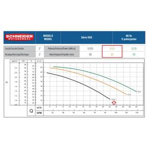 Especificações Técnicas: Corpo em polipropileno com 30% de fibra de vidro Rotor e Difusor em Noryl com 30% de fibra de vidro Bocais com rosca BSP Cesto do pré-filtro em polipropileno Intermediário de ferro fundido com pintura E-coat Selo mecânico constituído de aço inox AISI-304, buna N, grafite e cerâmica Motor elétrico IP-21, 2 polos, 60Hz Diâmetro Rotor: 123 mm Diâmetro Sucção: 2 Polegadas Diâmetro Recalque: 2 Polegadas Potência: 1,5 cv Tensão:220/380 Volts Fase: Trifásica Importante: Temperatura máxima do líquido bombeado: 50 C Pressão máxima de trabalho permitida: 21 m.c.a.