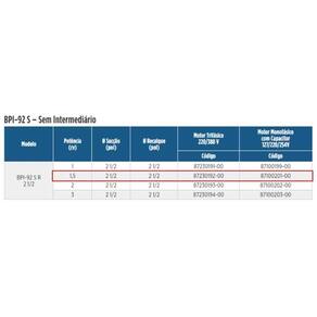 Especificações Técnicas: Bocais com rosca BSP Caracol da motobomba de ferro fundido GG-15 Rotor fechado de alumínio Selo mecânico constituído de aço inox AISI-304, buna N, grafite e cerâmica Linha S: motobomba sem intermediário Potência: 1,5cv Tensão: 220/380 Volts Fase: Trifásica Importante: Linha S: temperatura máxima do líquido bombeado 70C. Para bombeamento de água acima de 70C, utilize BPI-92 T, rotor de bronze e selo mecânico de Viton.