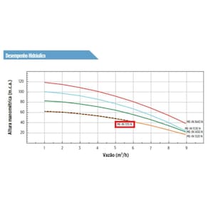 Especificações Técnicas: Potência: 1,5 cv Tensão:220/440V Volts Fase: Monofásica - com capacitor Número de estagios: 3 Diâmetro Sucção: 1 Polegada Diâmetro Recalque: 1 Polegada Pressão máxima sem vazão: 63 mca Altura máxima de sucção: 8 mca Diâmetro Rotor: 110 mm Material do rotor: aço inox Anel flutuante de aço inox AISI-304 Eixo de aço inox VC150 Bocais com rosca BSP Selo mecânico constituído de aço inox AISI-304, EPDM, grafite e cerâmica (até 3 cv) Lateral de entrada, divisão, corpo de saída, acoplamento e intermediário de ferro fundido Motor elétrico IP-21, 2 polos, 60 Hz (até 3 cv)