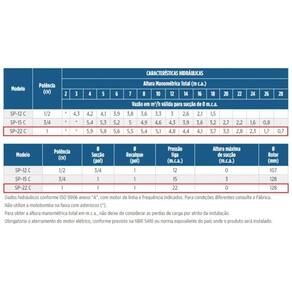 Especificações Técnicas: Modelo: SP-22C Potência: 1 cv Tensão:127 Volts Fase: Monofásica- com Proteção Térmica e Capacitor Permanente Diâmetro Sucção: 1 Polegada Diâmetro Recalque: 1 Polegada Diâmetro Rotor: 128 mm SP-22 C: motor IP-00 com capa de proteção, proteção térmica e capacitor permanente, 2 polos, 60 Hz Controlador eletrônico de pressão IP-65, corrente máxima 10 A, pressão máxima de trabalho 100 , entrada e saída: 1 x 1 Equipamento com válvula de retenção incorporada Possui Fluxostato