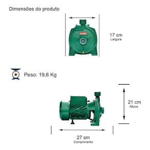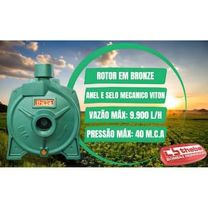 Motobomba Centrífuga Monoestágio - Monobloco - Motor Monofásico , 60Hz, 3500rpm - Bocais com rosca BSP, Sucção 1" x Recalque 1". - Eixo ponta em inox - Utilizada para água limpa até temperatura de 110ºC - Rotor fechado em Bronze. - Selo mecânico Anel O'ring de vedação da carcaça VITON. . Grau de proteção IP44 . Fornecedor Motor THEBE . Número de Fase MONOFÁSICO . Voltagem 127/220V ( Não e Bivolt ) . Potência 2,0 cv . Rotor 150mm . Pressão Máxima 40 MCA - Pressão Mínima 13MCA . Vazão Máxima 9.900 L/H, Vazão Mínima 1.200 L/H . Ambiente ABRIGADO . Material selo mecânico: VITON